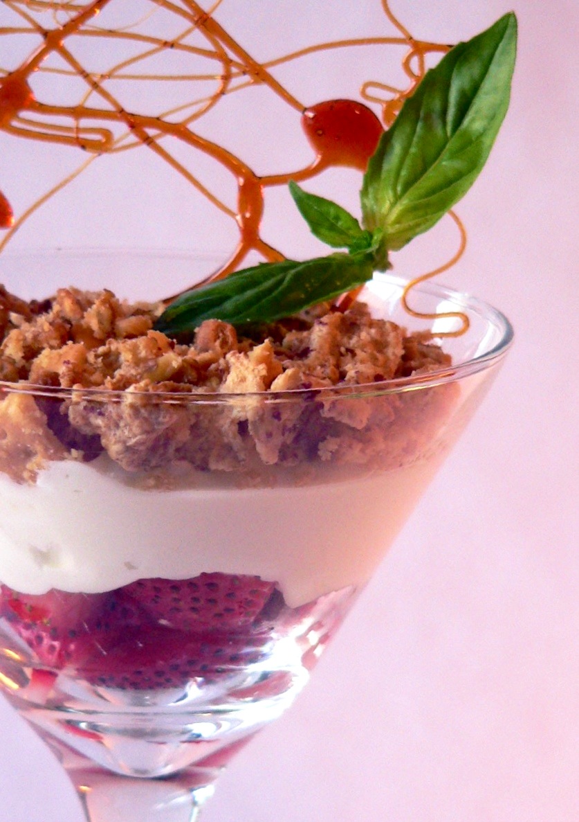 En una copa de martini llenamos el fondo con la mezcla de frutos rojos, sobre esta colocamos la crema de queso y por último el topping de galletas. Terminamos con una figura de caramelo.