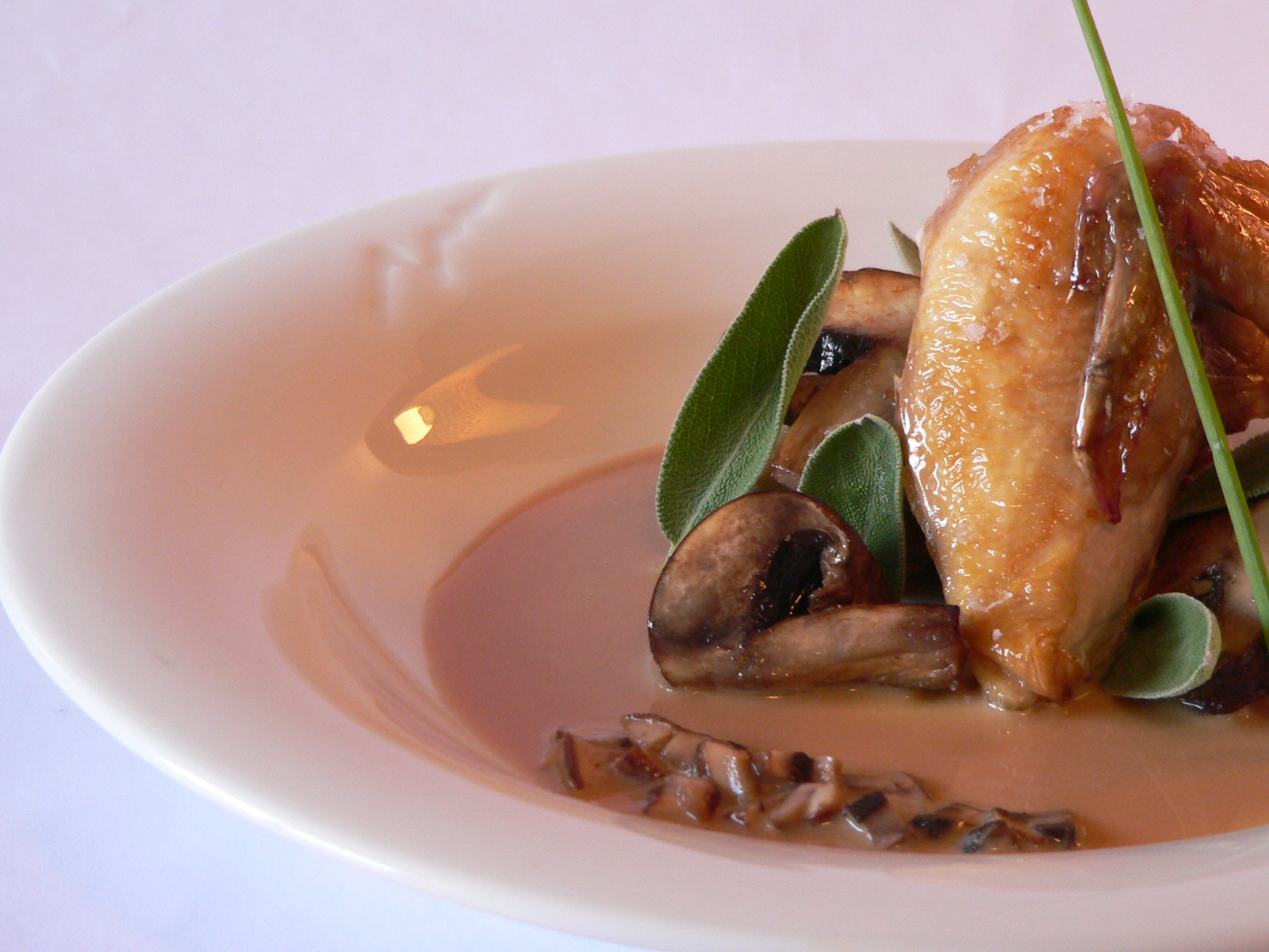 En plato hondo colocamos una base de natillas de hongos. Sobre esta montamos las codornices intercalando las láminas de portobello con las hojas de salvia. Salamos los portobello con flor de sal.