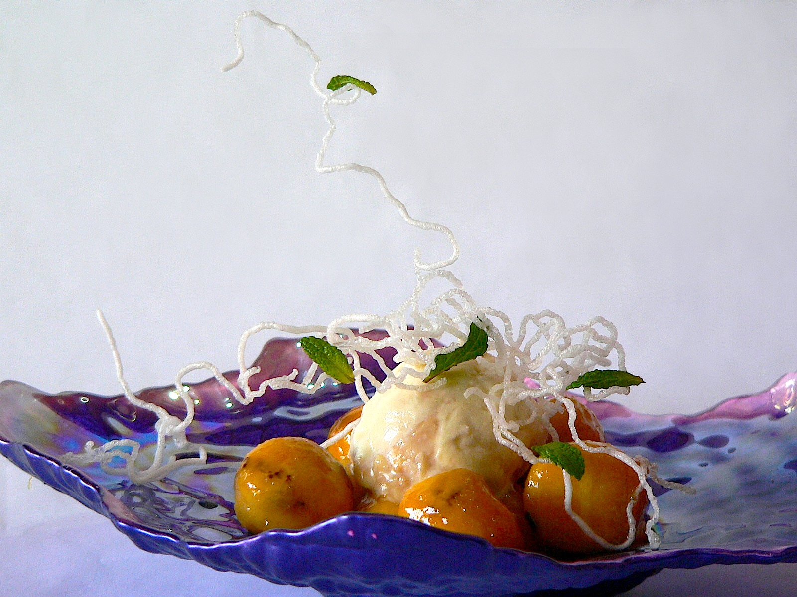 En plato de servicio colocaremos una base de tofee de ron, sobre este el guineo y lo servimos con un helado de fragante vainilla. Si quiere darle más espectáculo a su plato sírvalo con fideos de arroz fritos y pintados con un almíbar ligero (como los de la foto).