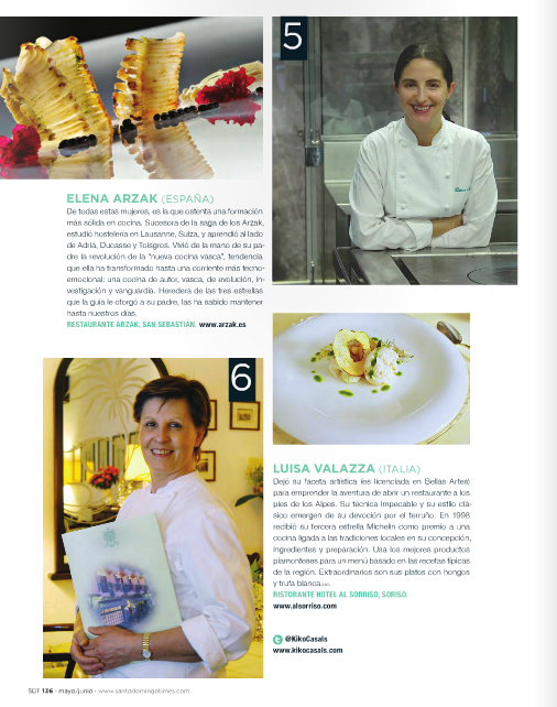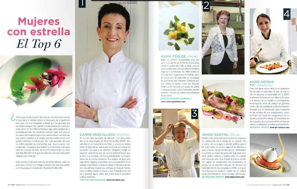 Para una edición dedicada a la mujer, no podíamos obviar un homenaje a las únicas 6 mujeres con tres estrellas michelin del planeta. Dos españolas (Carme Ruscalleda y Elena Arzak), tres italianas (Annie Féolde, Nadia Santini y Luisa Valazza) y una francesa (Anne-Sophie Pic) coronan los lugares más altos en el todavía machista mundo de la gastronomía.