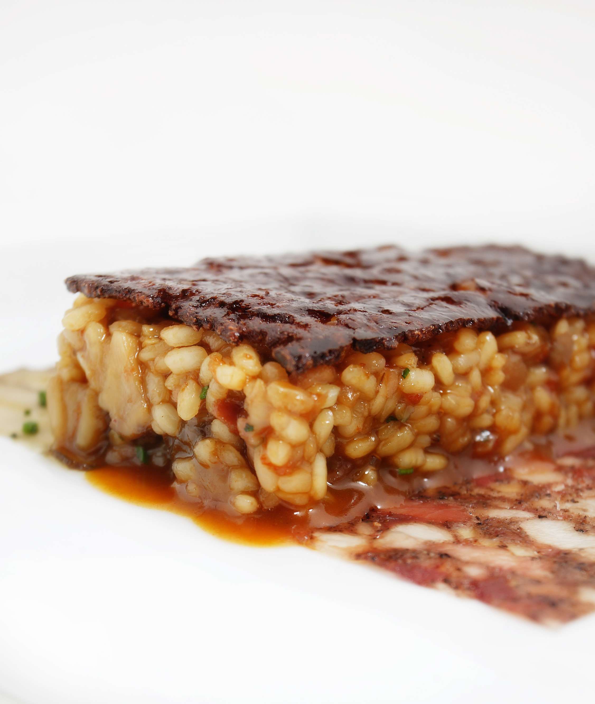 Fernando nos mostró lo más internacional de su cocina, la más viajada de sus propuestas, en un menú académico, cosmopolita en el que alternó lo regional con lo exótico. La cena se inició con unas Vieiras salteadas con Manzana verde y Coliflor, una entrada ligera, académica, delicada y sutil, una premonición a lo que iba a ser el resto del menú. El Arroz meloso y crujiente de manitas de Cerdo y Setas fue un canto al mediterráneo, a la cocina del arroz, a la de las casas de campo mallorquinas donde un crujiente “socarrat” servía de contrapunto a la pureza sápida del carpaccio. Cocina tradicional revisada, aligerada, llevada al siglo XXI. Con el Mero con piel de Sobrasada y Almendras cubrió el pescado con una piel del tradicional embutido, un mar y montaña ingenioso, una maniobra ente grasos y magros, armónica pero sorprendente.