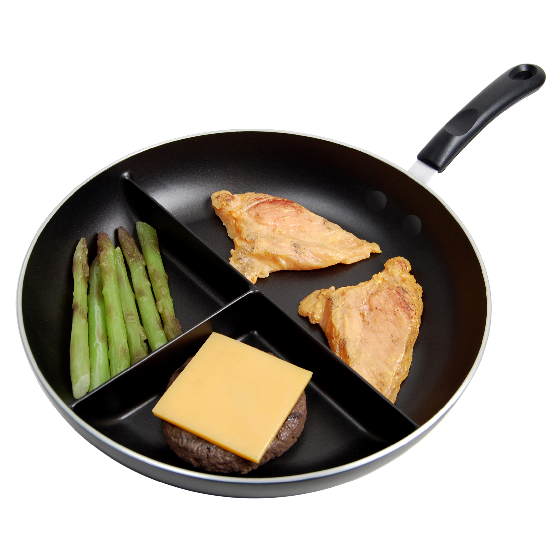 Se trata de un sartén como cualquier otro, con la simple particularidad de que tiene tres compartimentos independientes, de manera que podemos cocinar varias pequeñas raciones al mismo tiempo, sin mezclar los sabores.