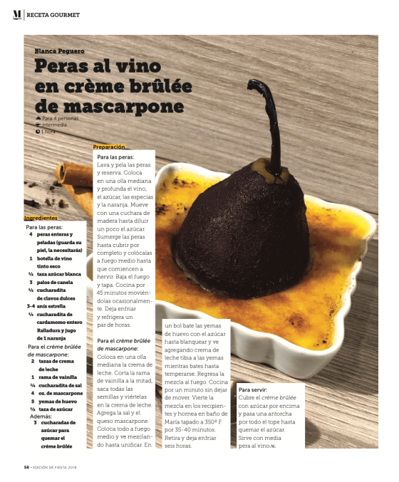 Para servir: cubre cada crème brûlée con azúcar por encima y con una antorcha quema todo el tope hasta quemar el azúcar. Sirve con media pera al vino.