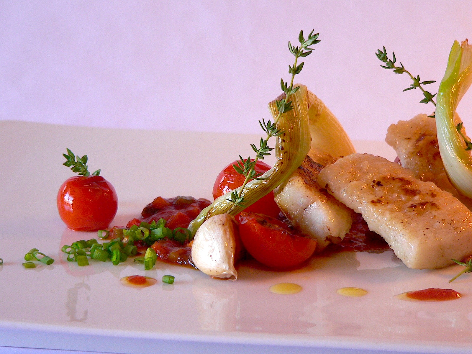 En el plato colocamos los filetes de chillo, y el salteado. Terminamos can ramitas de tomillo fresco.