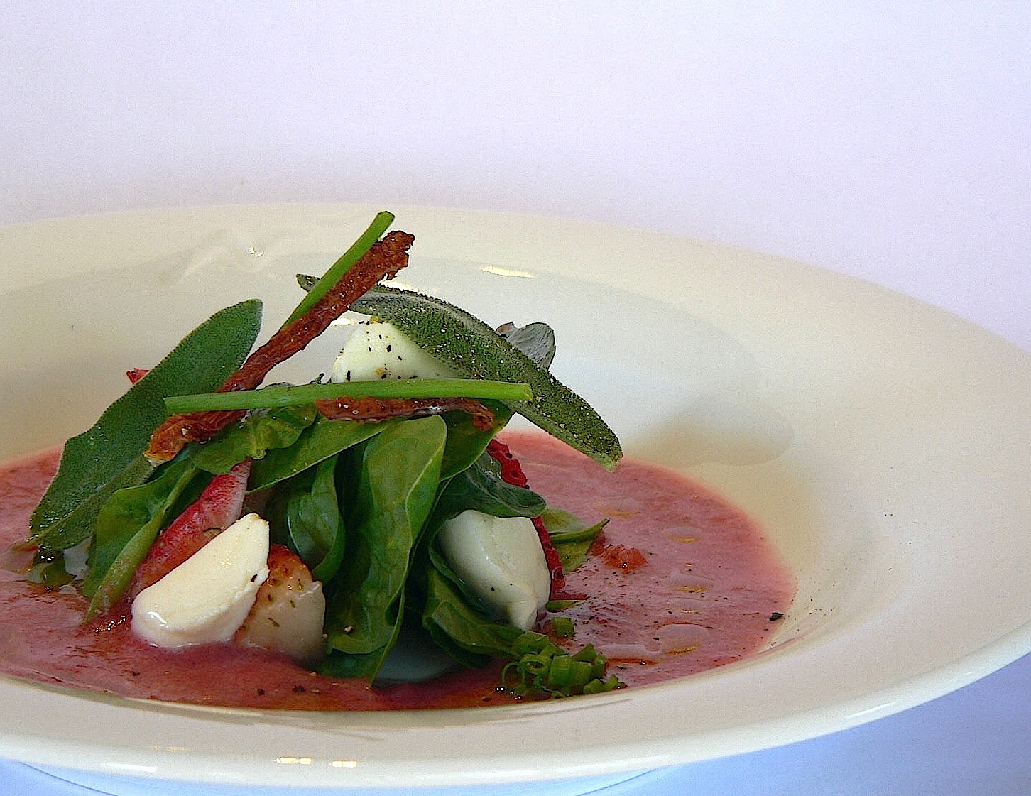 Ensalada: 2 manojos de espinacas frescas, 12 mini-bolitas de mozzarella, 12 fresas, 6 pétalos de tomate resecado al sol, hojitas de salvia.