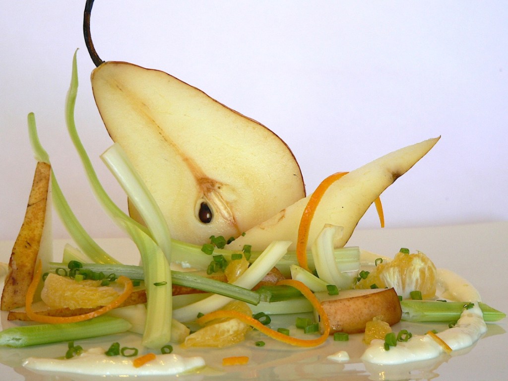 Ensalada: 4 tallos de apio, 4 peras a gajos, 2 naranjas a gajos, piel de una naranja.