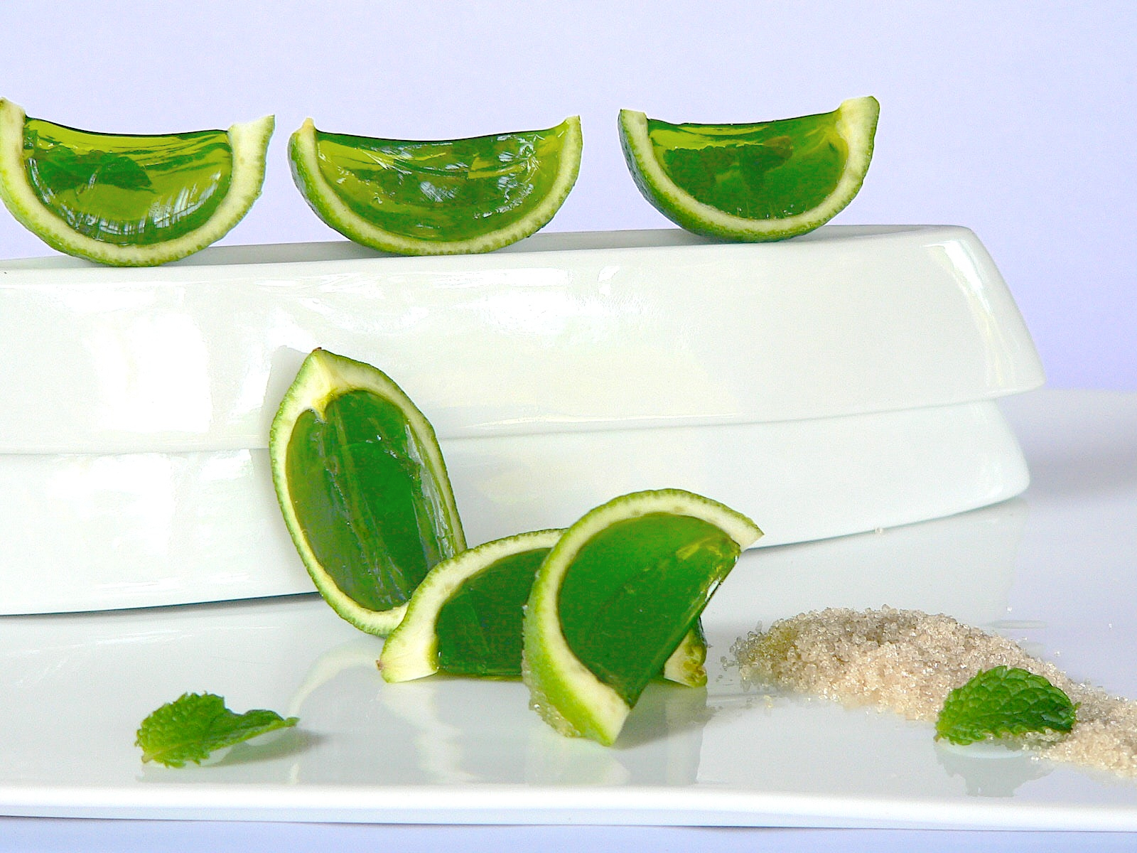 Para la gelatina: cortamos los limones por la mitad y los vaciamos de su pulpa. Calentamos el agua con el azúcar. Fuera del fuego diluimos las láminas de gelatina hidratadas, el jugo de limón y el ron. Colamos y añadimos la hierbabuena picada. Rellenamos las cáscaras de limón y dejamos enfriar en nevera.