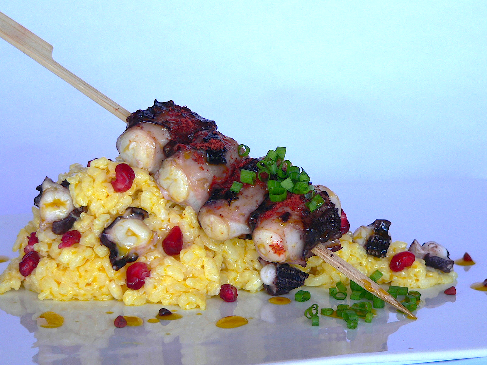 Para el arroz: en aceite rehogamos la cebolla y el ajo, añadimos el pulpo y la bija. Cocemos hasta que adquiera un color dorado. Incorporamos el arroz y mojamos con el vino y el fumet de pescado. Salpimentamos. Cuando el arroz esté cocido y fuera del fuego añadimos las semillas de granada. Servimos con una brocheta de pulpo a la plancha espolvoreada de bija molida.