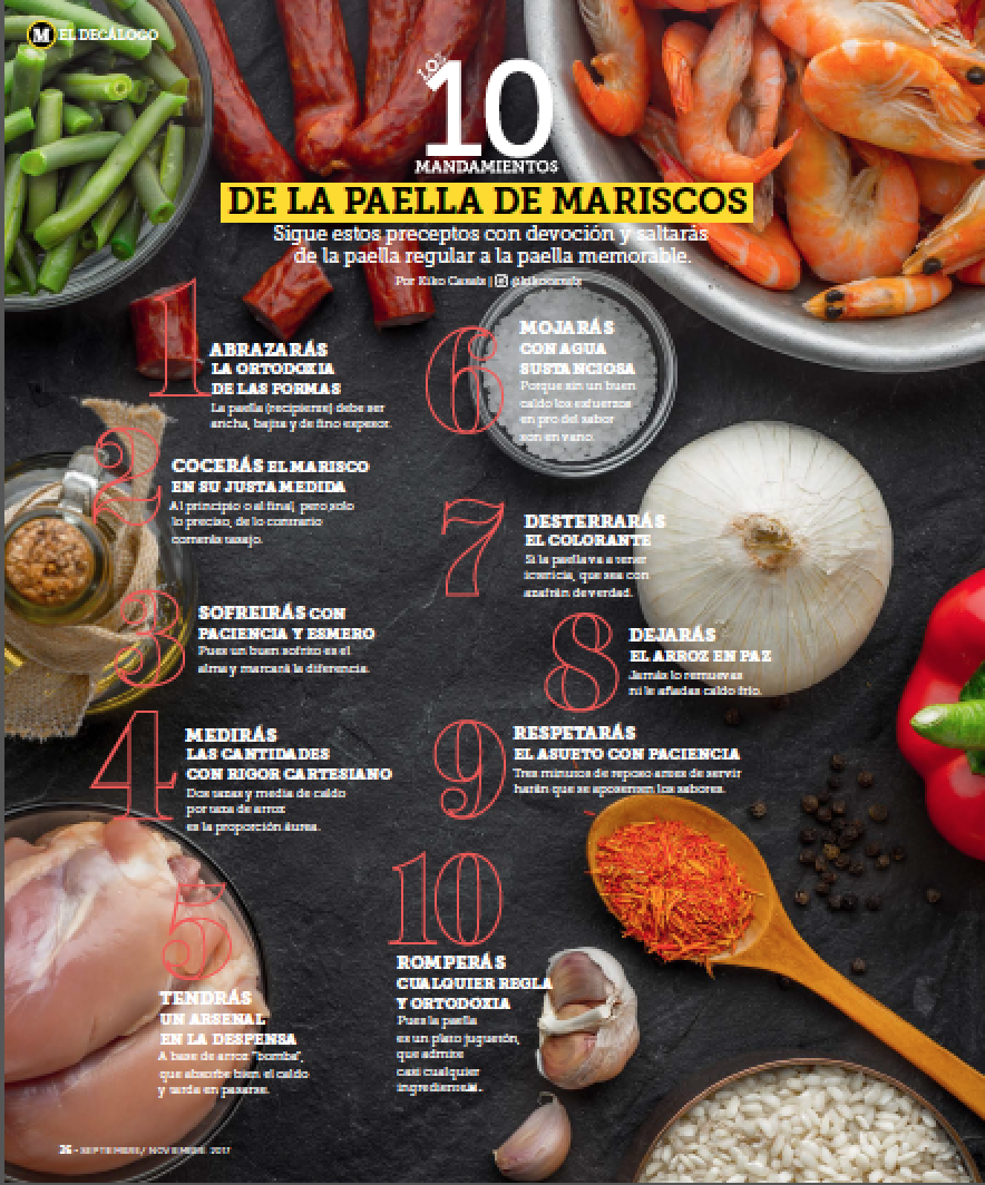 Publicado en Manjar (Septiembre 2017) Sigue esos preceptos con devoción y saltarás de la paella regular a la paella memorable 1 Abrazarás la ortodoxia de las formas La paella (recipiente) debe ser ancha, bajita y de fino … Sigue leyendo